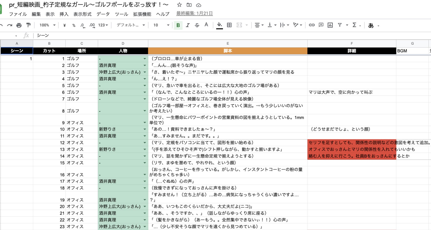 脚本も最初は形式も分からず、スプレッドシートに書いてました。以下、書き殴っていた当初の脚本の様子です。
