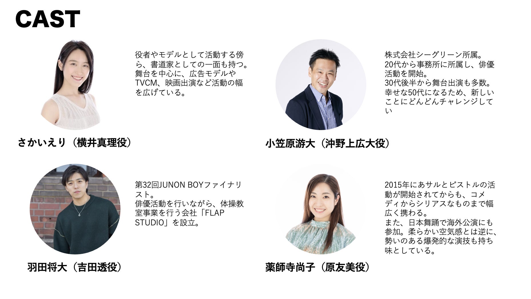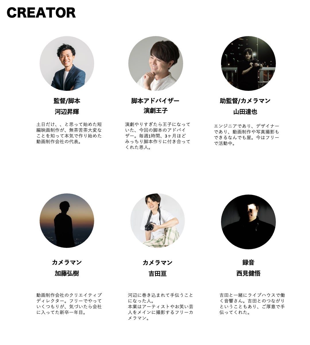 今回出演してくださったキャストさん(一部除く)です!みなさん個性派ですが、演技への熱量がすごく、私たちが無理難題を提案しても、全て快く対応してくれました。