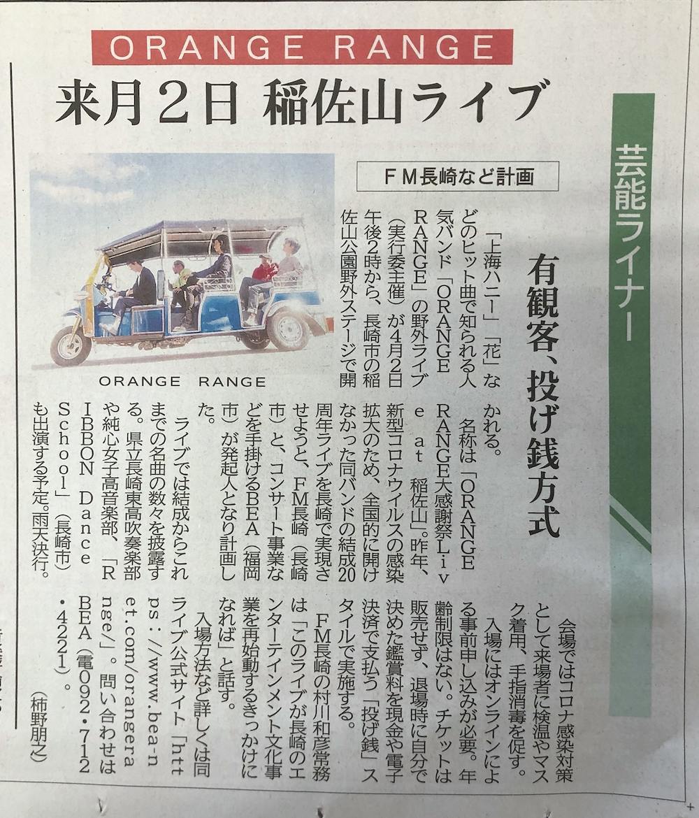 そんな中、地元長崎では、本日 長崎新聞社さんが 今回のORANGE RANGEの稲佐山に向けた記事を掲載してくださいました!この稲佐山での成功は、色んな方の希望が含まれてるので、こうして 各社の皆様が、各社の立場で熱量を届けていただけるのは 本当に嬉しいです。改めて 開催に向けてチャレンジして良かったと思ってます!