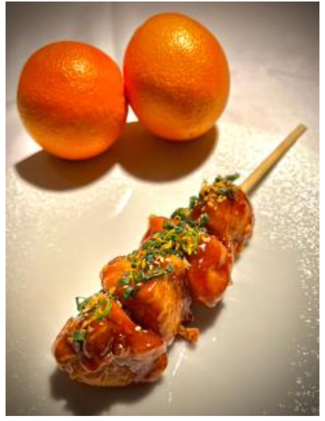 長崎県産ハーブ鶏をジューシーに揚げ、オレンジやハチミツベースの甘塩しょっぱいソースに絡めたチキン棒。まさにスウィートハニーな味わい!