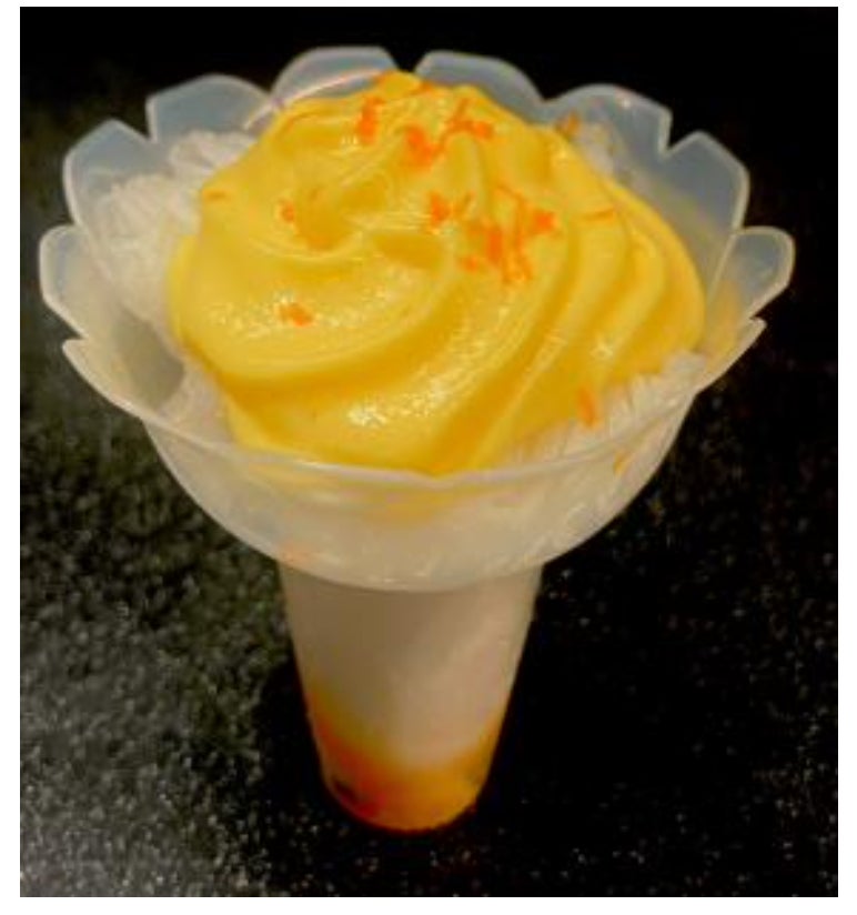 『チーズベース』のかき氷と果肉の上に、オレンジ風味のムースソースをかけたカキ氷。一見、イケナイ組み合わせかと思いきや絶妙な味わいのバランス!