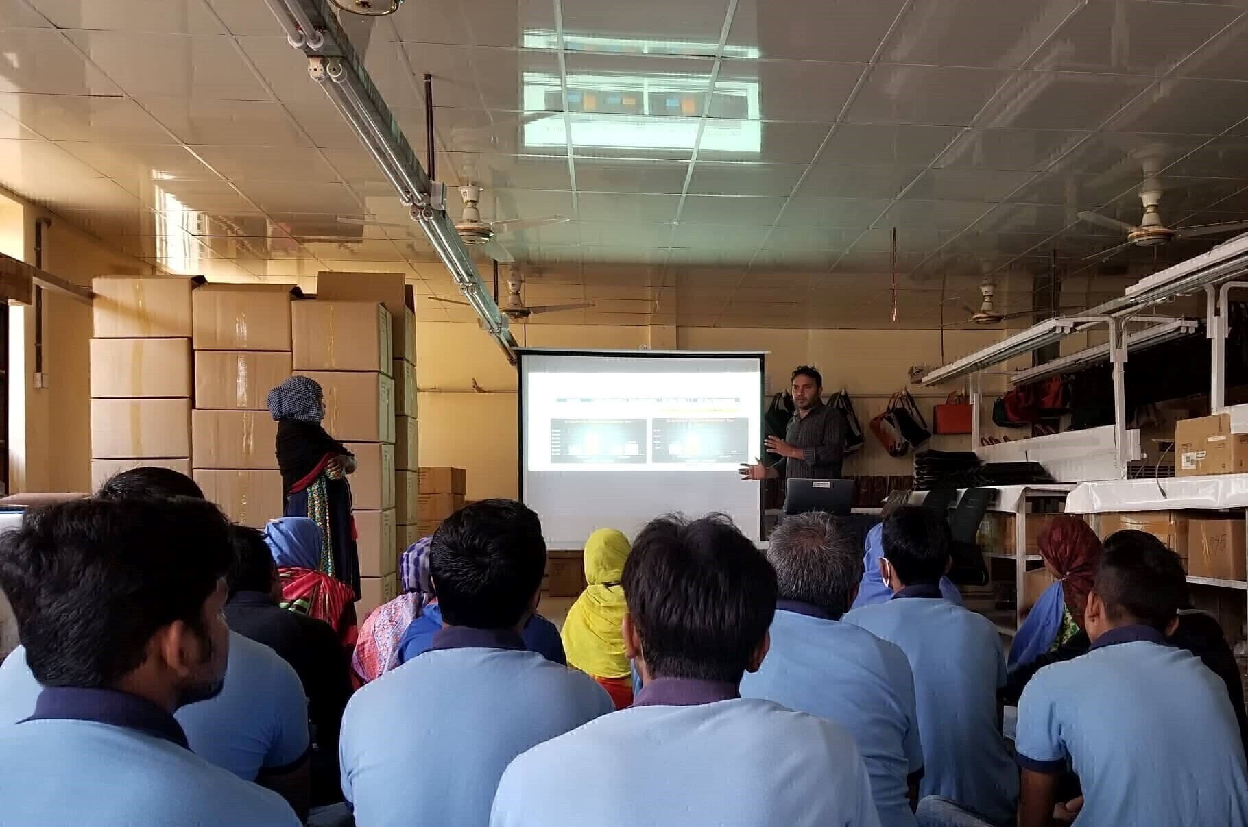 * 検品会社にて、朝礼で成果を報告し合う様子