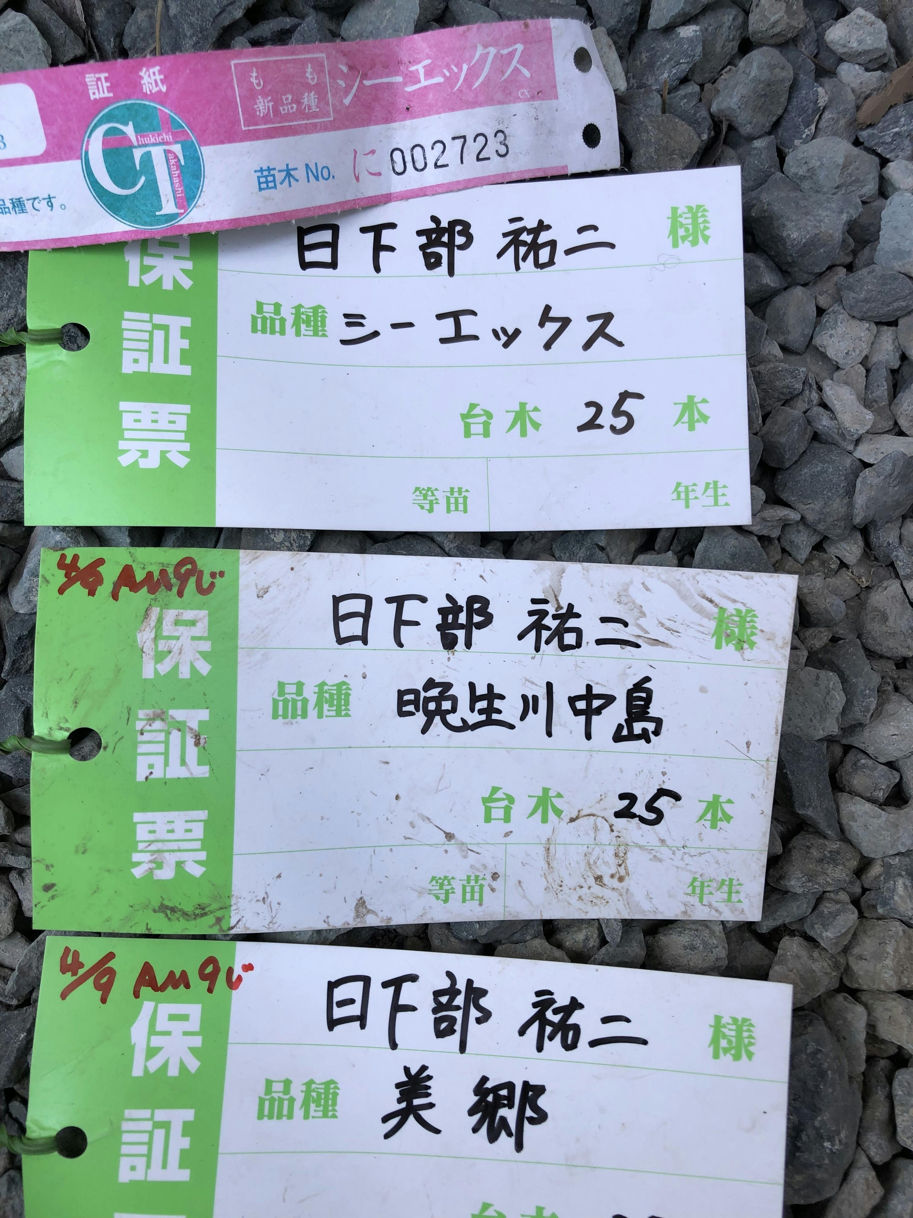 さて、本日、チーム桃ちゃん3兄弟の植樹です! 3銘柄、計75本植えますから、人足も頼んで、総勢5人(ごっちゃん含む)で作業します(^.^)