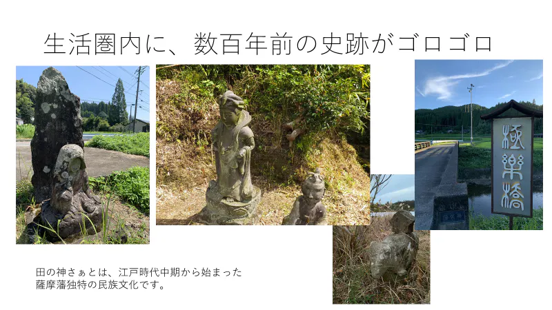 極楽(ごくらく)、平和(へいわ)、祝儀園(しゅうぎぞの)など、ご利益がありそうな地名も多く、小高い丘に囲まれ中央に網掛川が流れる自然豊かな地域でありながら、鹿児島空港から車で15分という便利な場所にあります。