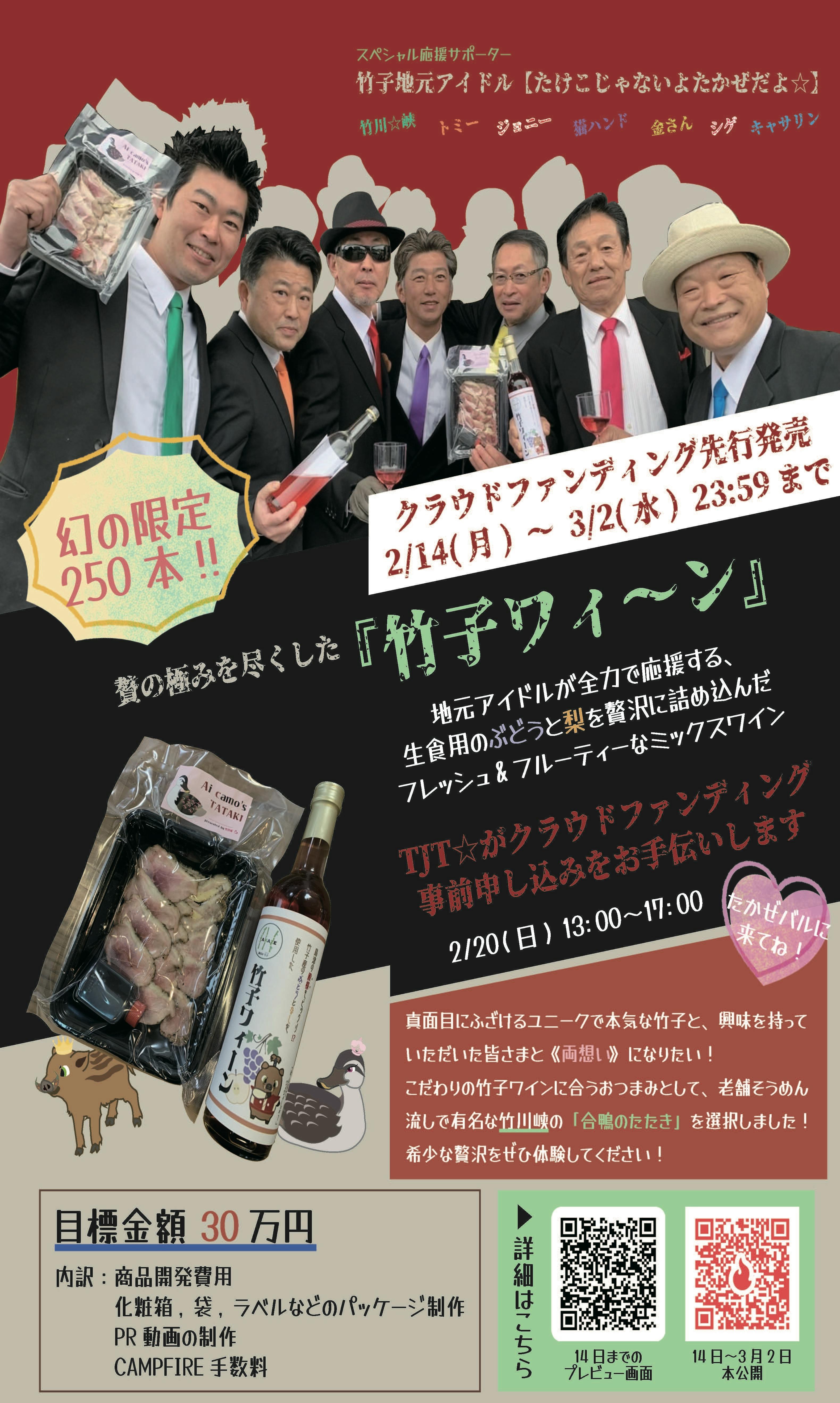 2022/02/15 16:35皆様いつもお世話になっております。 昨日、クラウドファンディング初スタートを切りました!現在、鹿児島県のみならず全国32名の方からご支援いただいております。目標金額も2日目にて69%も達成!こんなに嬉しく、ありがたいことはありません。改めまして感謝申し上げます!!初めての試みということもあり、公開前夜、そして初日、とにかく不安と期待でもうぐちゃぐちゃだった感情が少し持ち直してきました(笑) 目標である竹子ワィーンを通じて、皆様と両想いになりたい気持ちに変わりはありません。2月20日(日)13時~ ふれあいサロンたかぜバル(霧島市溝辺町竹子607-1)に竹子地元アイドルTJT☆がやってきます。物産館きらく館と同じ敷地にございますので、竹子の美味しい農産物などのお買い物もお楽しみいただけますよ~。ぜひ会いに来てください! クラファン公開後のURLhttps://camp-fire.jp/projects/view/551513SNSなどで情報を拡散して頂けると大変嬉しく思います。 引き続き皆様のご支援のほどをよろしくお願いいたします! もっと見る