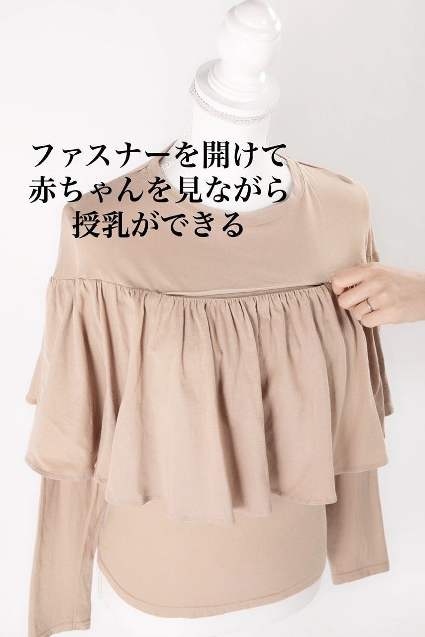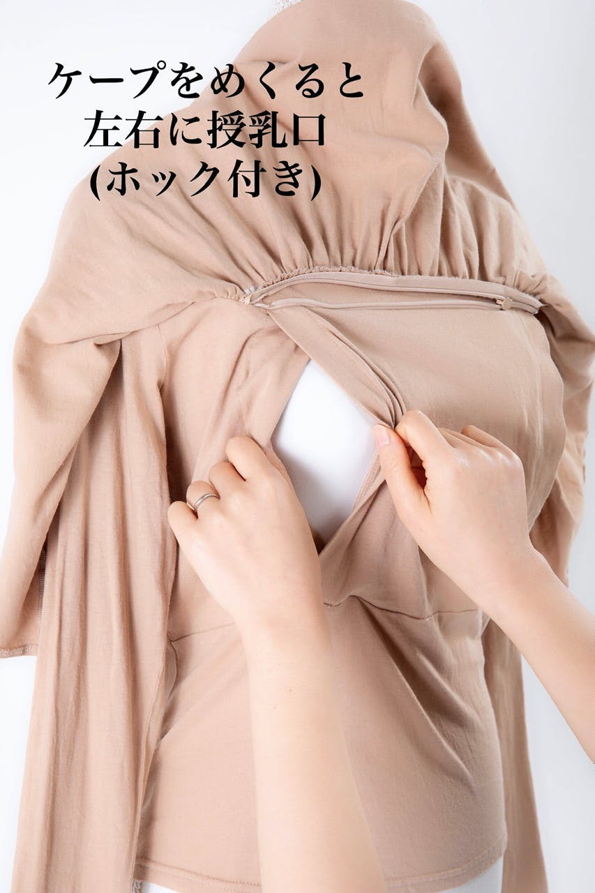 360度のドレープが授乳ケープの代わりになり、スマージュ1枚でそのまま授乳できます。フロント部分はファスナーで開閉でき、授乳口までスムーズに赤ちゃんを誘導でき、赤ちゃんを見ながら授乳できます。詳しくは動画をご参照ください。