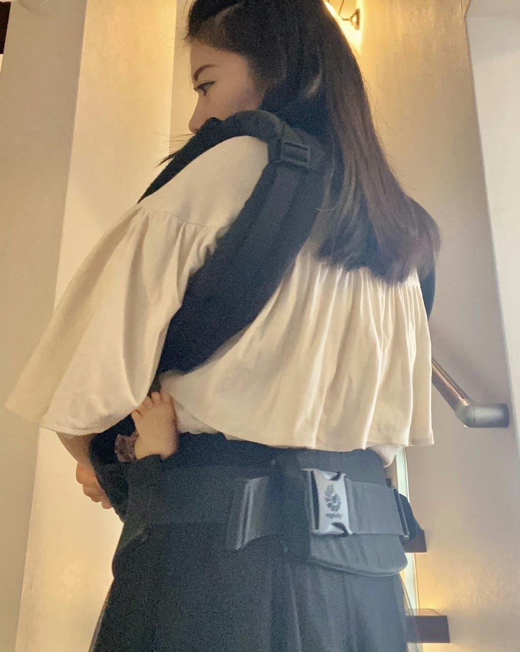 また抱っこ紐の着用を妨げないよう、後方のドレープは短めです。