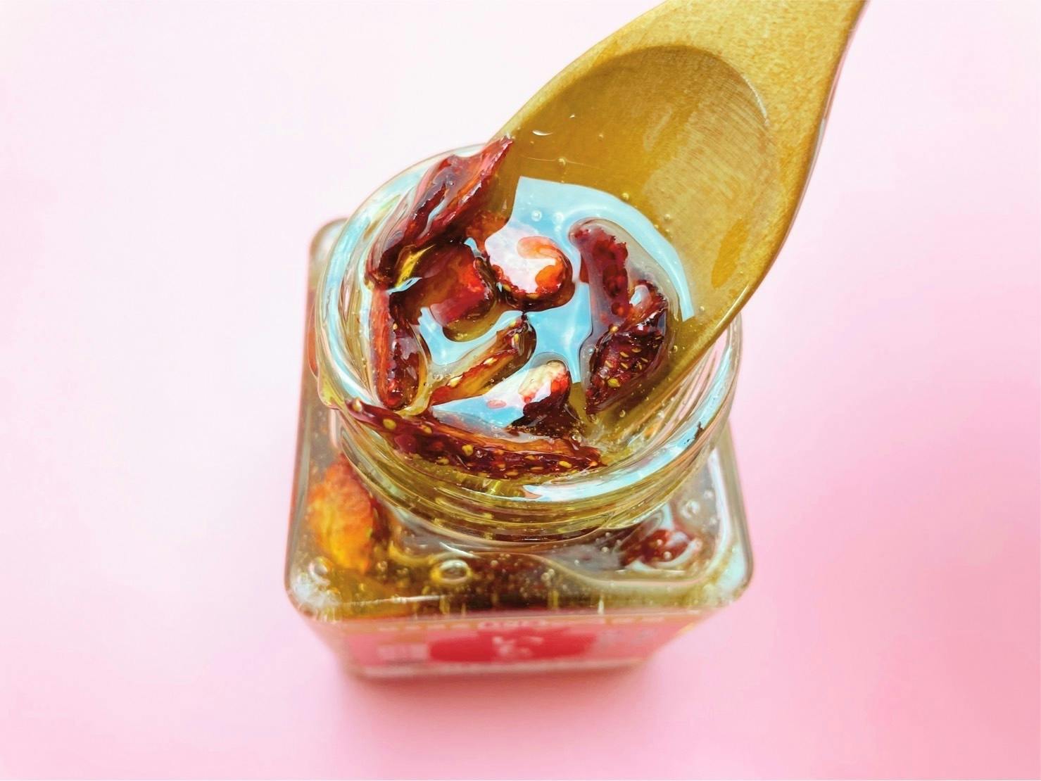 ①岐阜県産天然はちみつ に、②岐阜県山県市産いちご紅ほっぺ をじっくり漬け込み、はちみつの持つ濃厚な「まるごと岐阜県が楽しめる!おいしい苺はちみつ」が誕生しました!