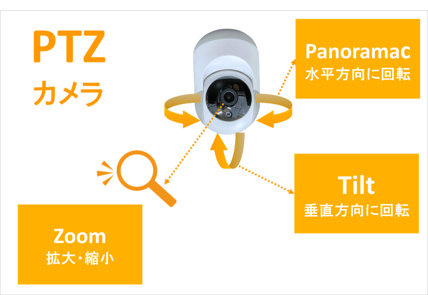 PTZはパン(Panoramac)・チルト(Tilt)・ズーム(Zoom)の頭文字をとったもので、下記の3つの機能を持ちます。