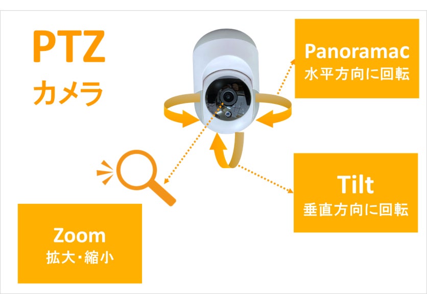 PTZはパン(Panoramac)・チルト(Tilt)・ズーム(Zoom)の頭文字をとったもので、下記の3つの機能を持ちます。