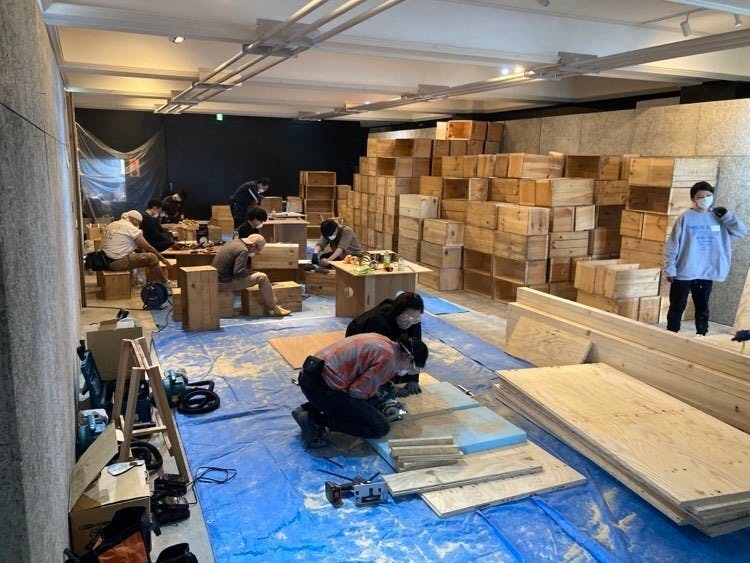 オランドギャラリー&2階にて「りんご箱工務店」がオープンしました!先週末から八戸工業大学の大学生に弘前に来てもらい、共に今回のゲストハウスのりんご箱ベッドを製作しています。先生はもちろんりんご箱ベッドも設計している蟻塚さん!です。