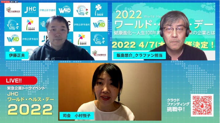 開催当時の27日午後、慌ただしく活動報告にて開催告知をさせていただきました”JHCワールド・ヘルス・デー2022 クラウドファンディング挑戦中トークイベント”を無事開催させていただきました。…ご覧いただけましたか?^^