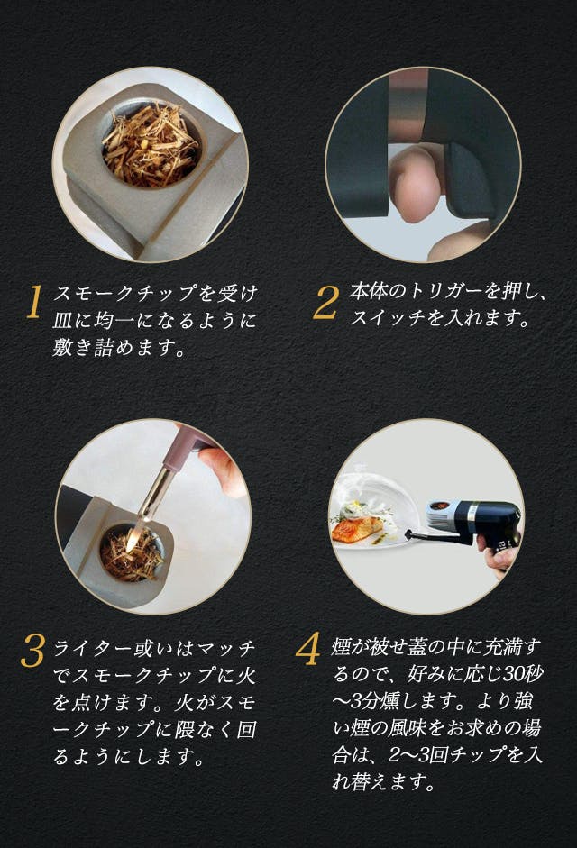 【HOMIA SmorkGun】の先端にある受け皿に自分のお好みのスモークチップをセットし、ライターで火を点けるとその煙をスプレーガンが吸い込み、集中的に食材に煙を燻します。