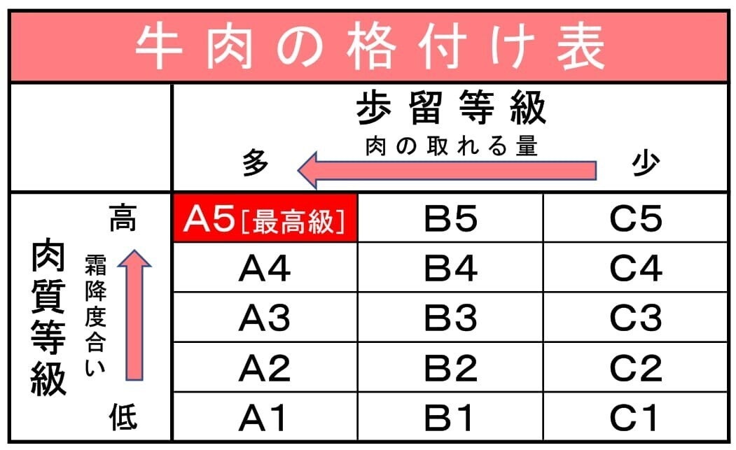 量を表した「歩留等級」 と脂肪交雑等で評価される「肉質等級」により、最高級のA5から最低のC1まであります。