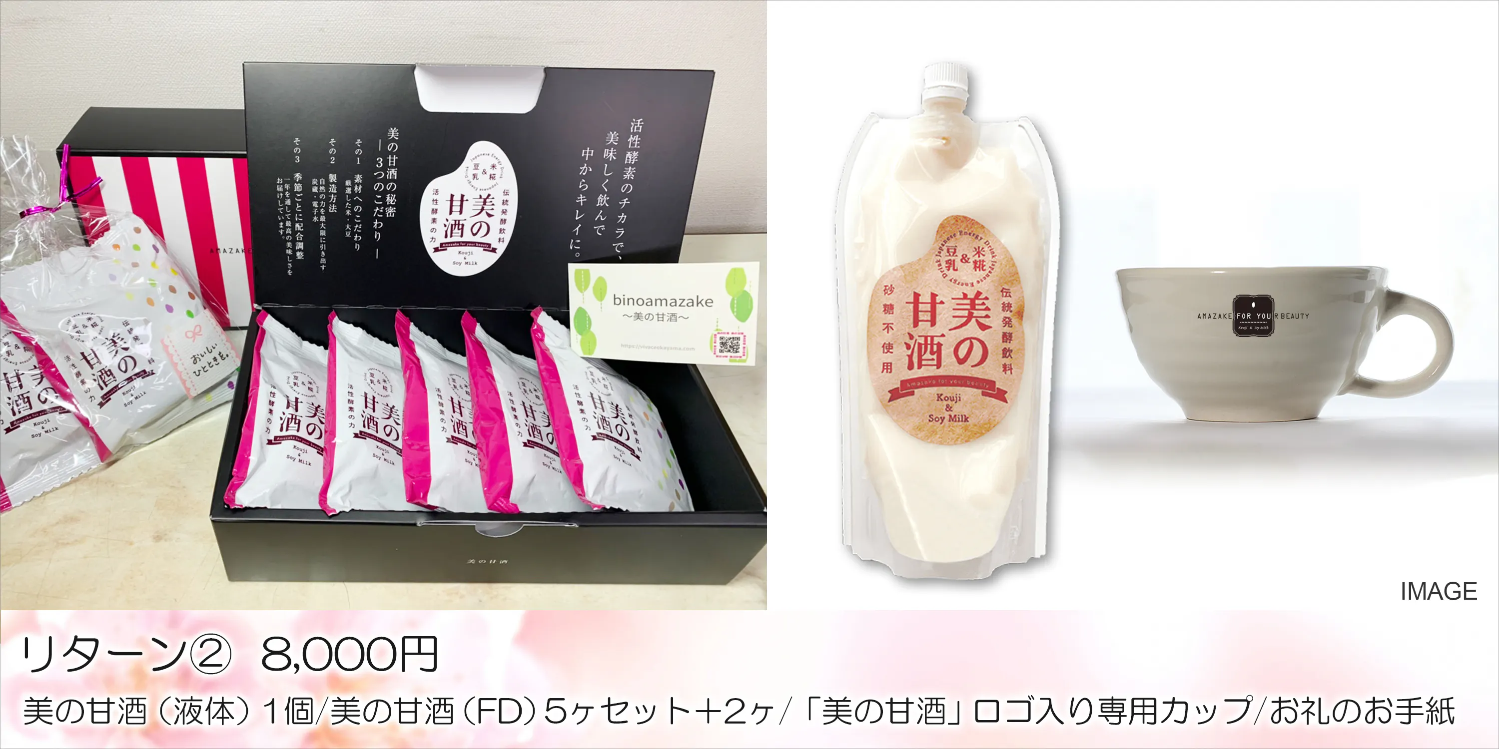リターン②(8,000円):美の甘酒( 液体)1本/美の甘酒( FD )5ヶセット+2ヶ/「美の甘酒」ロゴ入り専用カップ/お礼の手紙