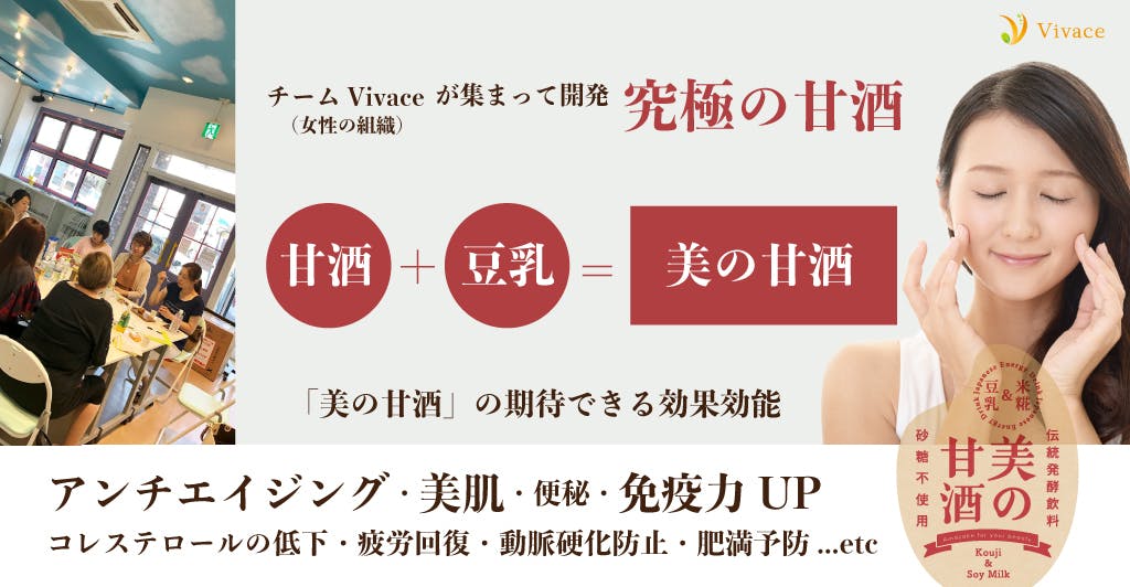 美の甘酒は5年前に「チームVivace」の女性メンバーが集まり、「甘糀SOYフローズン」を開発しイベントで販売したことが発端となります。のちに女性のための健康美飲料として、「美の甘酒」を2019年、本格的に商品化しました。