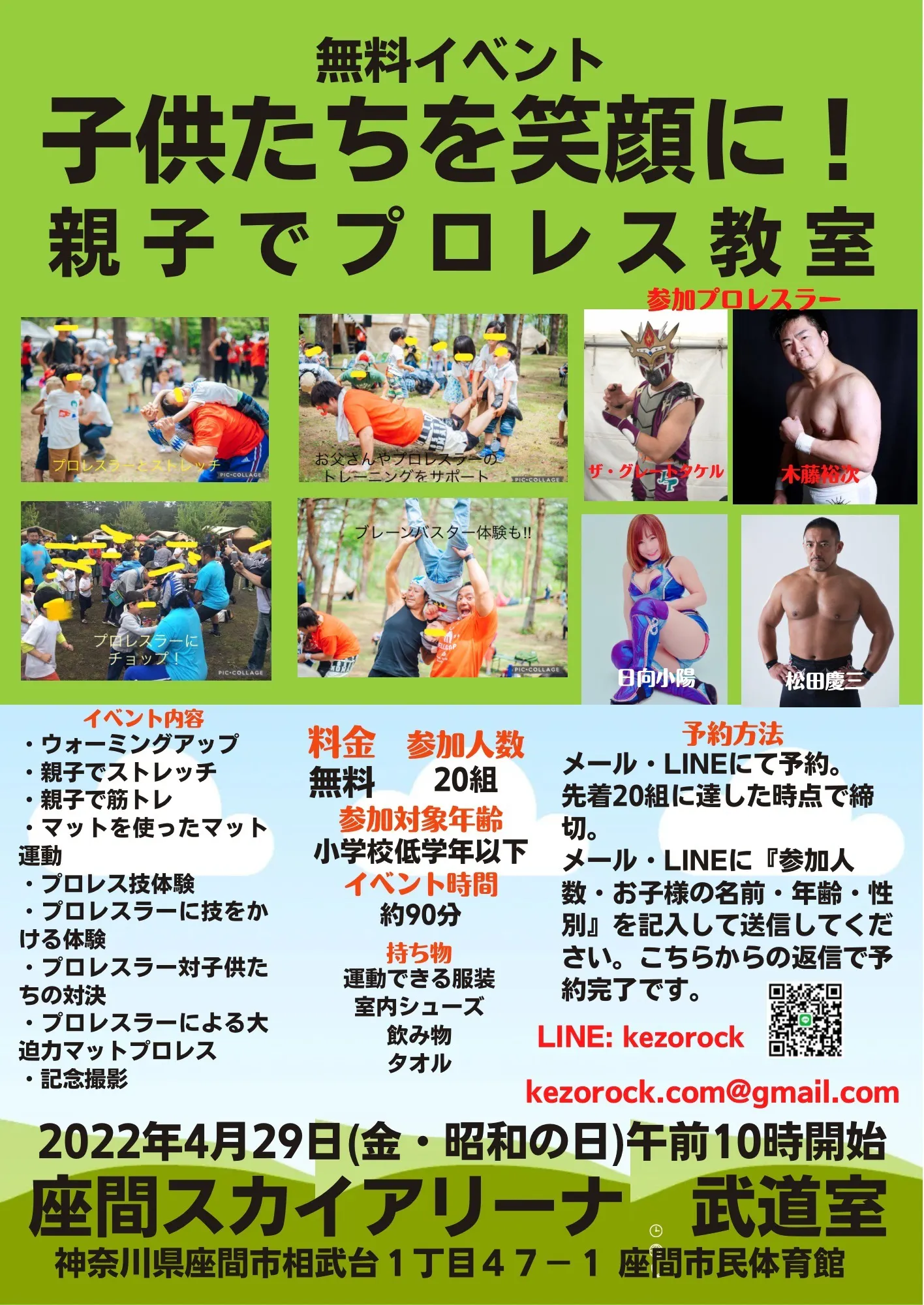 親子で出来るストレッチやトレーニングを一緒に現役プロレスラーとやって、最後にはプロレスの試合を見て楽しんでもらう【親子でプロレス教室】をやります!