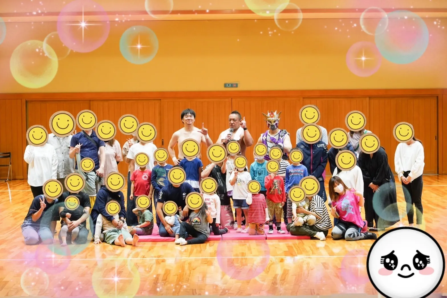 【イベント内容】ウォーミングアップ ストレッチ 筋トレ マットを使ったマット運動 プロレス技体験 プロレスラーに技をかける体験 プロレスラー対子供たちの対決 プロレスラーによる大迫力マットプロレス 記念撮影