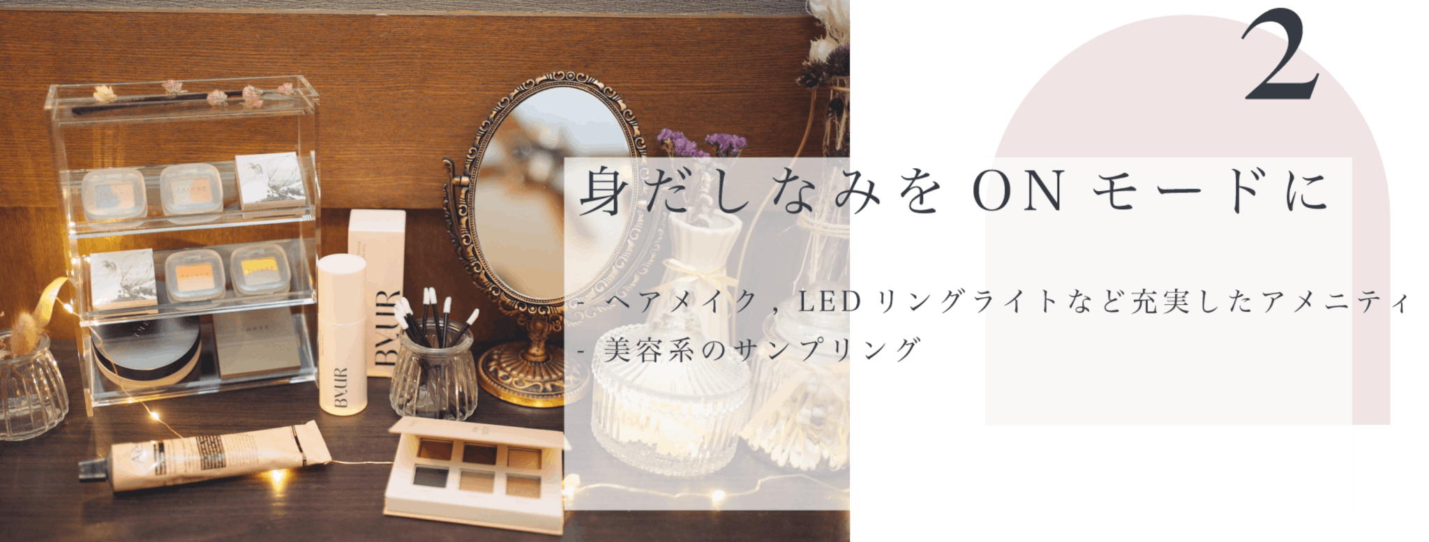 - 急な商談や、会食前にも安心のコスメやヘアアイロンなどのアメニティも充実
