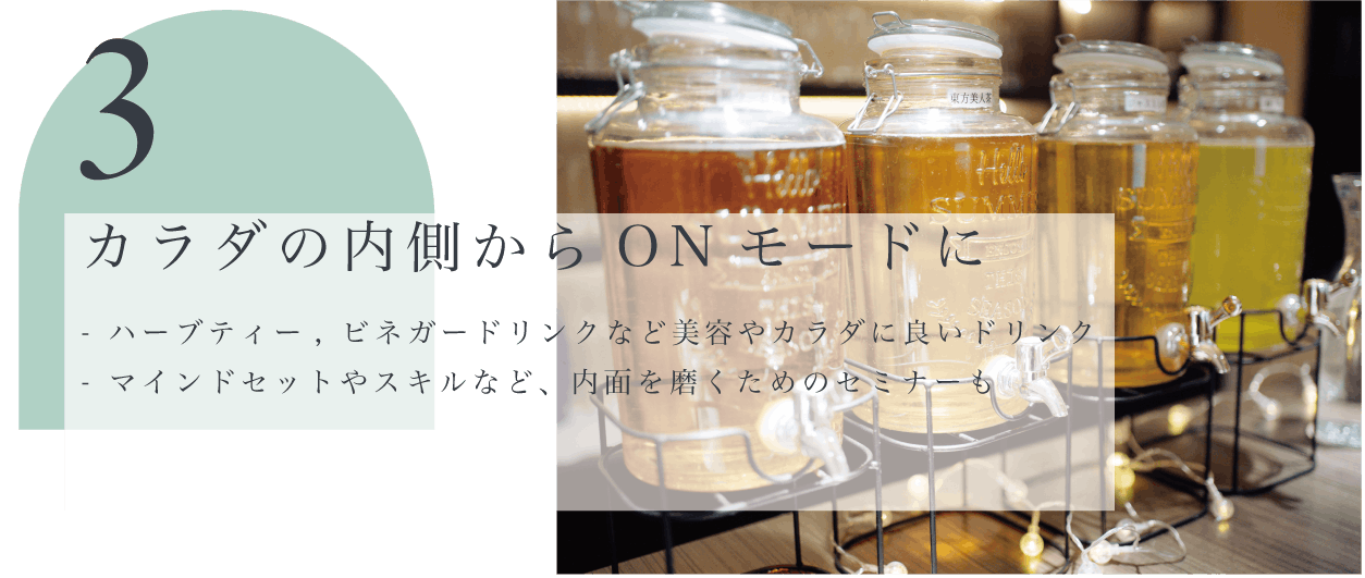 「ワタシを "ON" に」する空間とアメニティ、ドリンク&フードを提供しています。