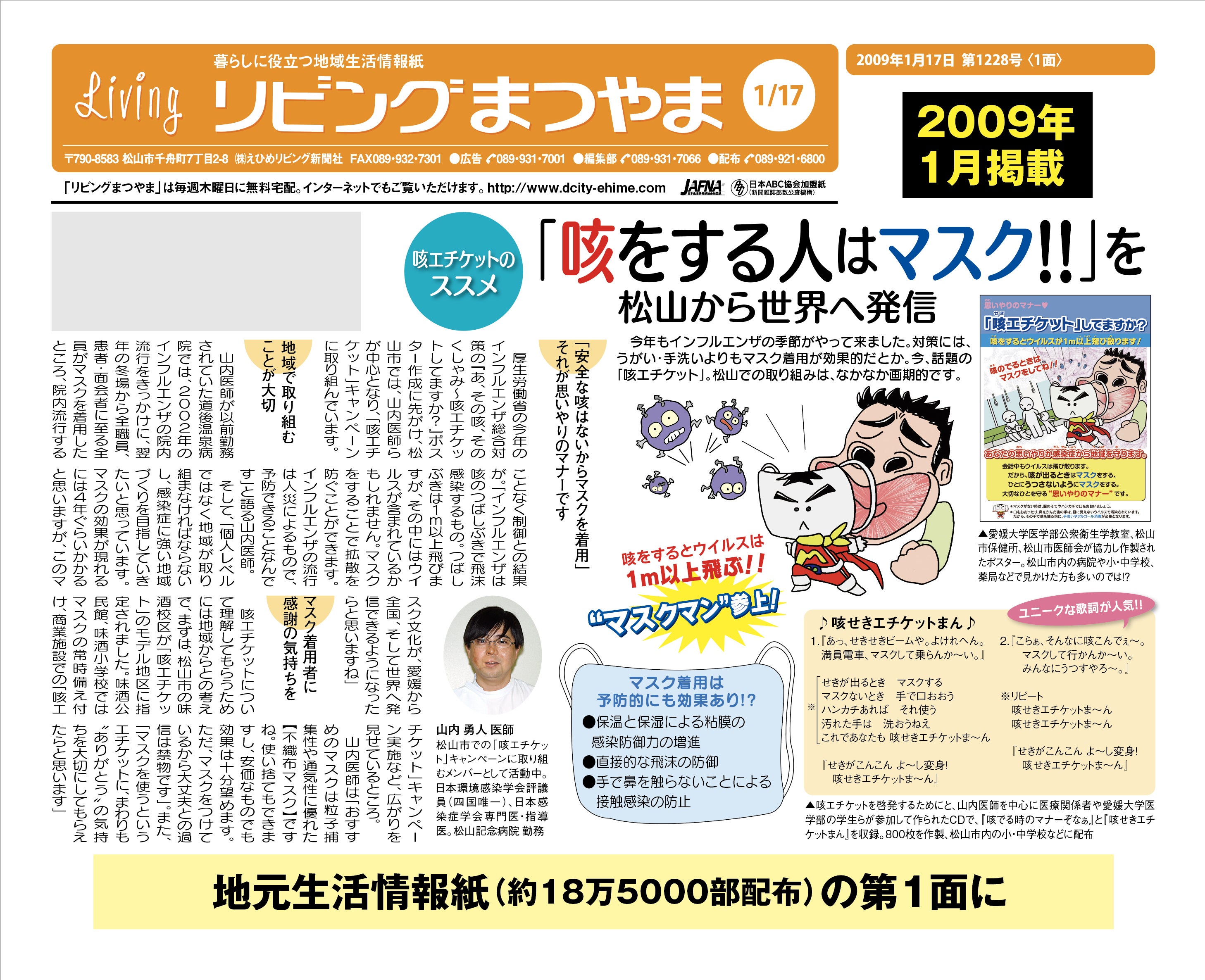ずっとインフルエンザの研究をしていたことから、新型インフルエンザや季節性インフルエンザの感染制御に情熱を傾けていた山内先生に声をかけられ、先生の前任地の松山に招かれたのがきっかけでした。 マスクと換気の重要性は今では誰もが知るところですが、あのころから先生は、医療現場と地域社会への啓発に、取り組まれていました。まわりに多くの仲間が集まり、愛媛大学の学生さんたちとマスクの歌のCDをつくって広めていたことを懐かしく思います。