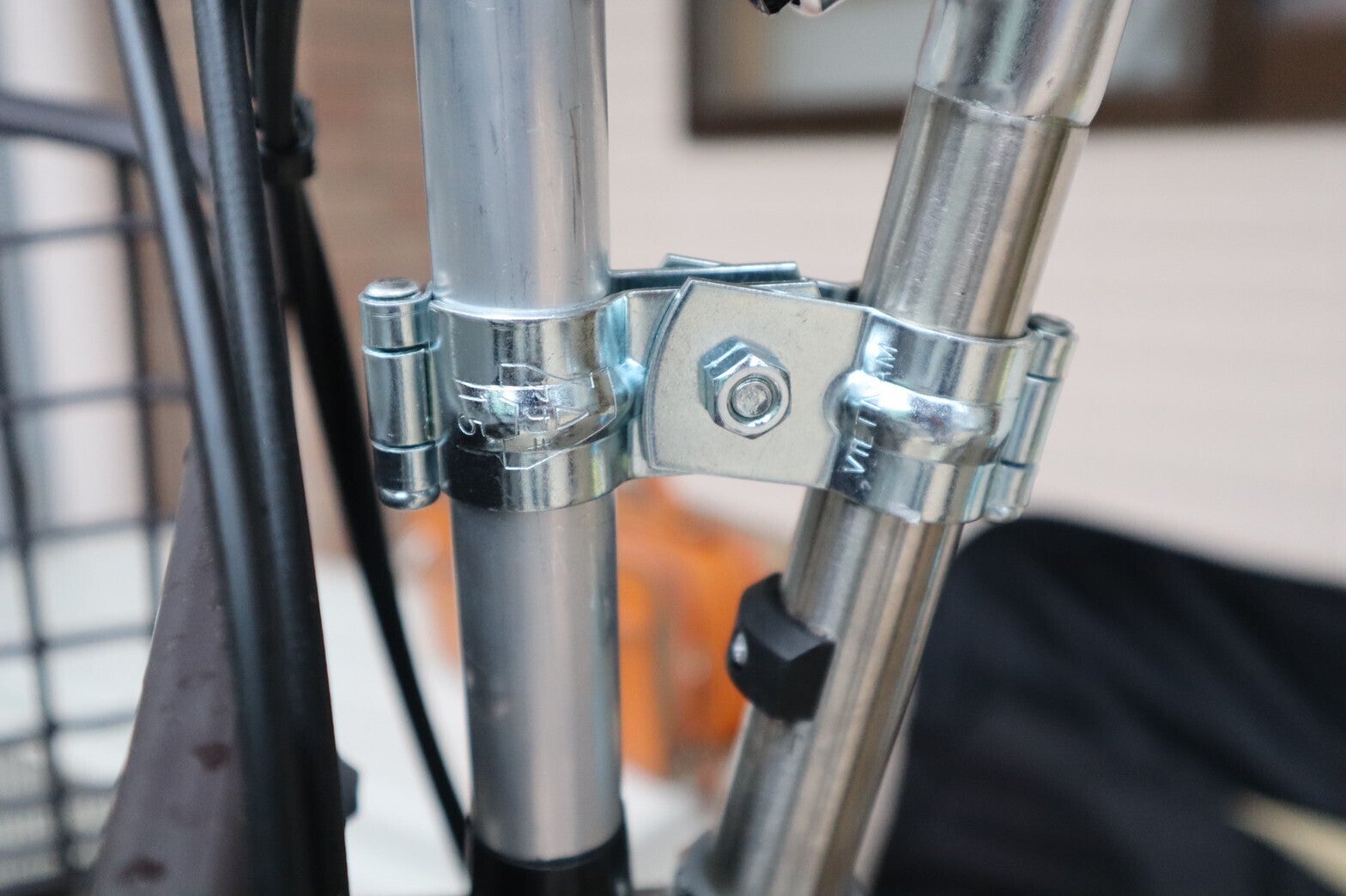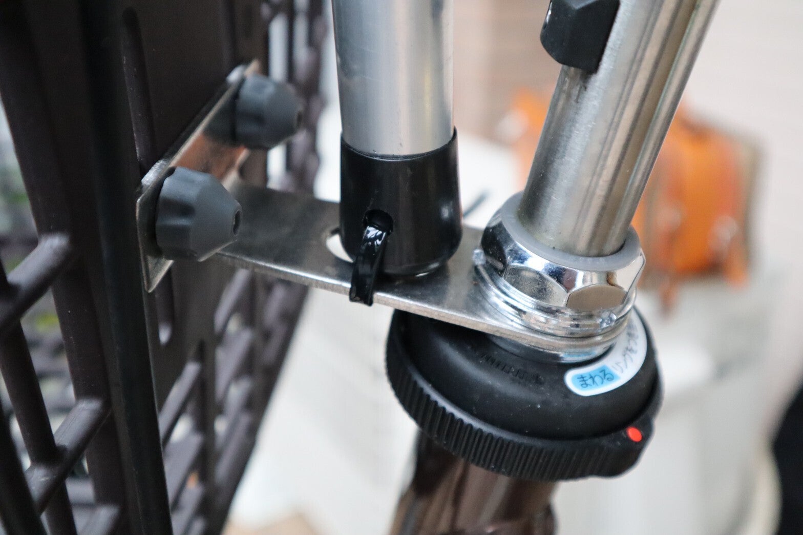 ①付属の芯棒を自転車のカゴ金具に付属の結束バンドで取り付ける。
