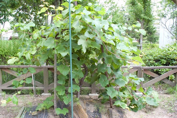 ぶどう棚は,園芸支柱を組み合わせた,ばぁちゃん手づくりの キャシャな作りで,
