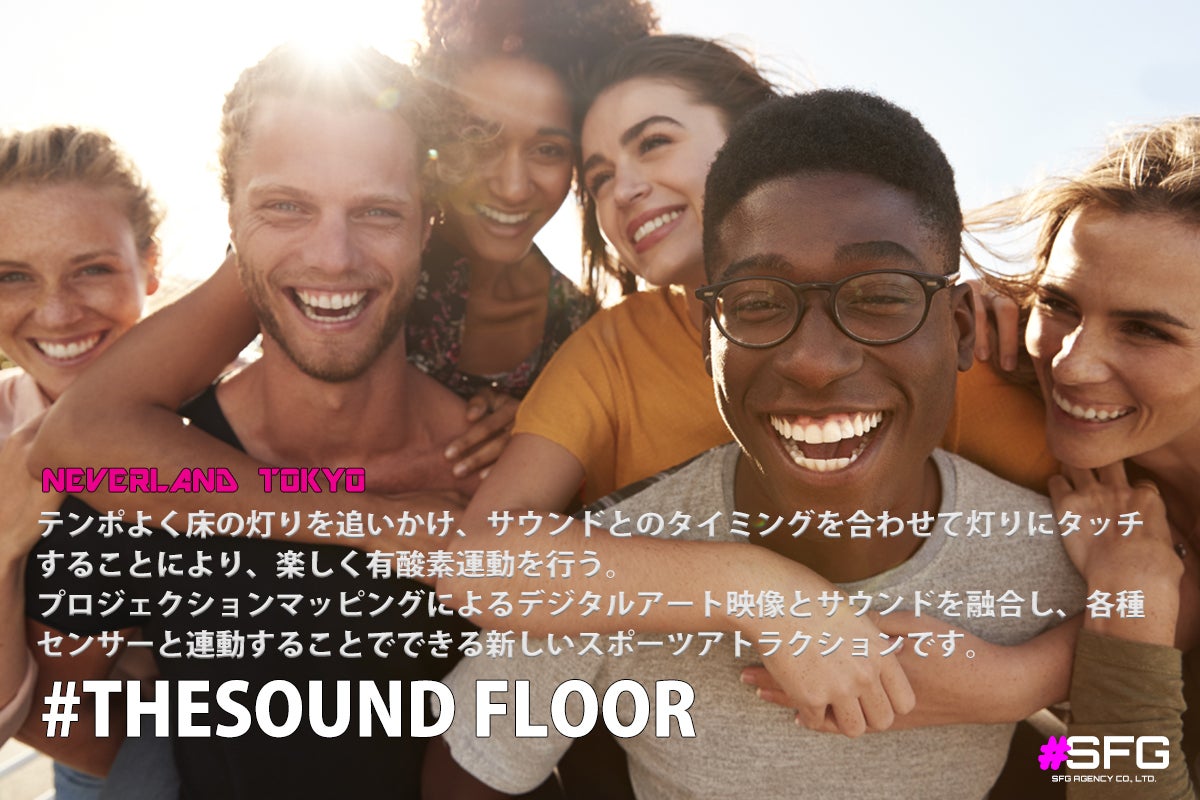 テンポよく床の灯りを追いかけ、サウンドとのタイミングを合わせて灯りにタッチすることにより、楽しく有酸素運動を行う。プロジェクションマッピングによるデジタルアート映像とサウンドを融合し、各種センサーと連動することでできる新しいスポーツアトラクションです。