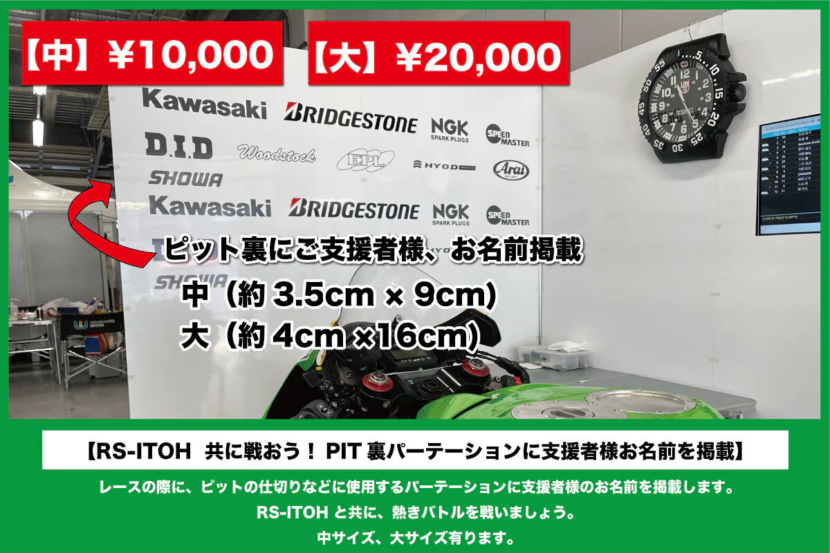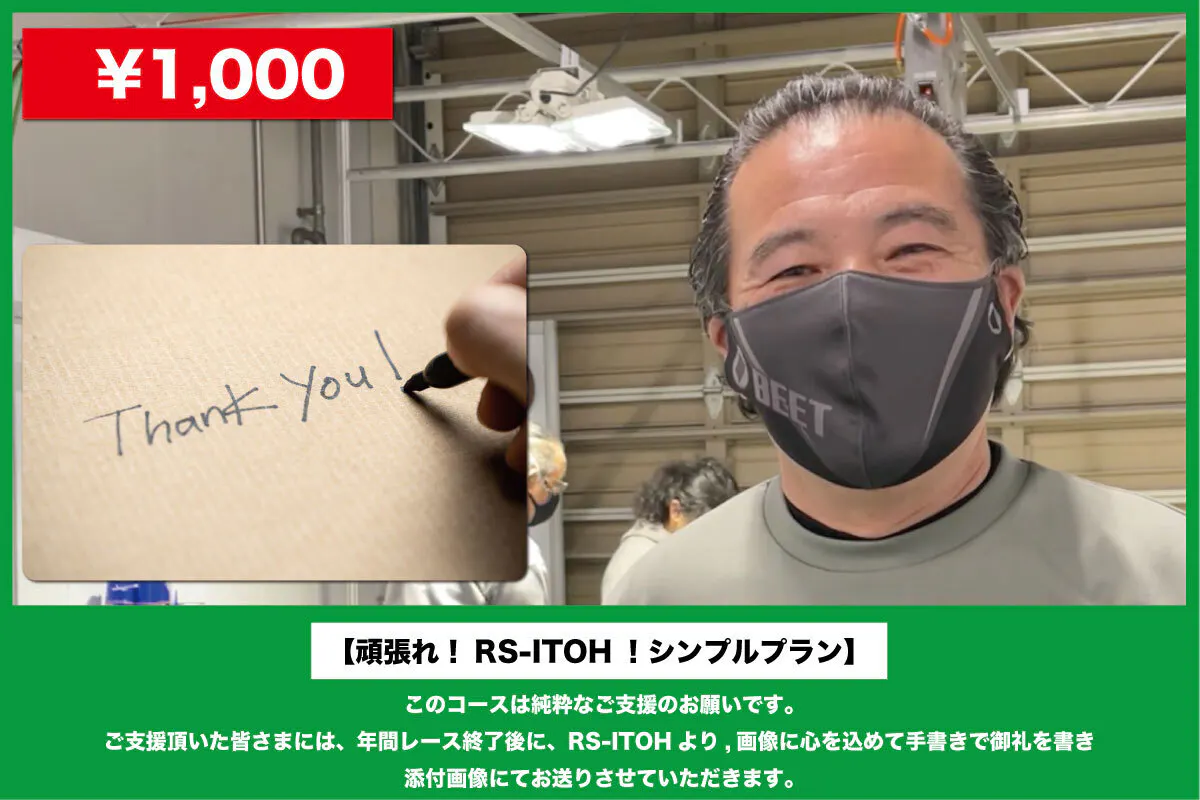 コロナウィルスにより、モータースポーツにおいても、2年連続で「鈴鹿八耐」が中止になる等、厳しい状況が続いていますが、光のさす未来に向け”レースの情熱”を持ち続け、この試練を乗り越える事。今こそ「RS-ITOH」の情熱が試されています。この苦境を乗り越え、共に戦って頂けるサポーターを募集します。