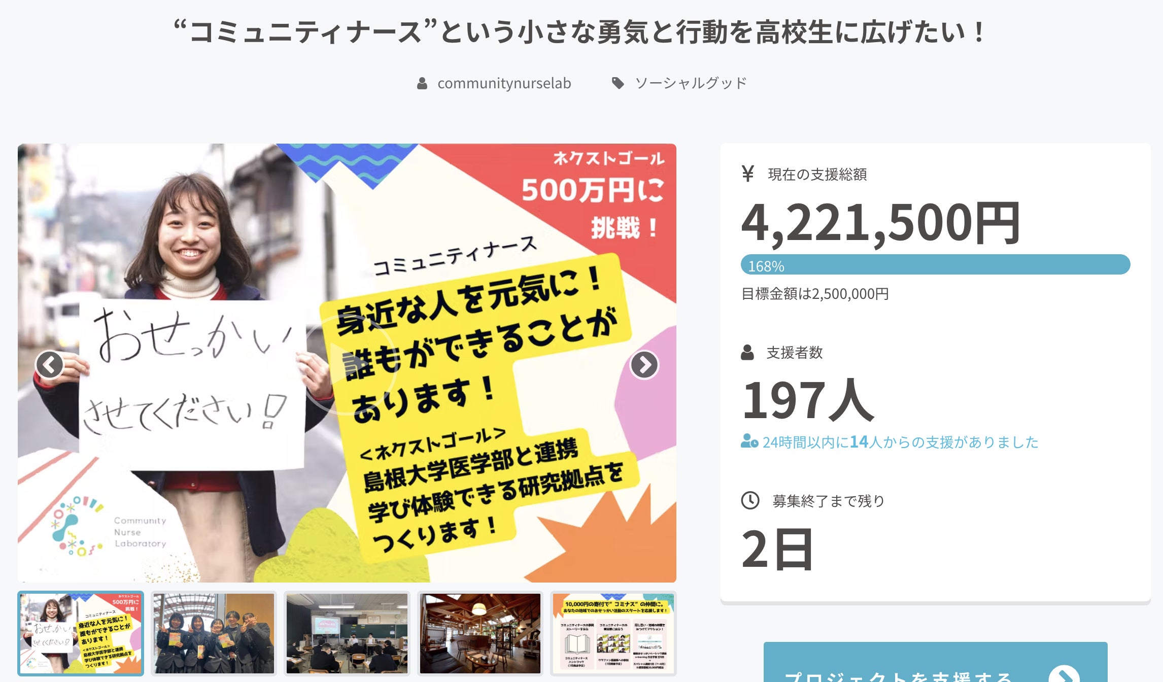 500万円を目指して、あと2日!おせっかいの輪をともに広げる仲間として、このアクションをともに広げる仲間に、シェアや寄付という形でご参加ください。
