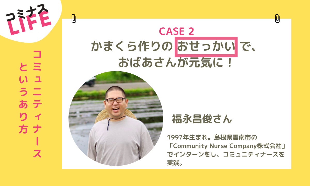お二人目は、福永昌俊さん。1997年生まれ。島根県雲南市の「Community Nurse Company株式会社」でインターンをし、コミュニティナースを実践。