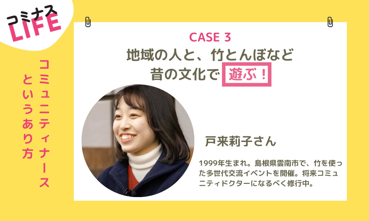 3人目は、戸来莉子さん。1999年生まれ。島根県雲南市で、竹を使った多世代交流イベントを開催。将来コミュニティドクターになるべく修行中。
