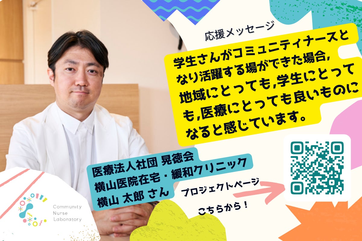 応援メッセージご紹介 vol.06コミュニティナースの全力応援者、横山太郎さんから応援メッセージをいただきました!寄付の応援のみならず、医師としてコミュニティナースを自社のクリニックで育て、自身でも学ばれ、チーム一体で診療や地域活動を展開されています。横山さんのように、今回のプロジェクトの成果物を「フル活用」して目指す社会を一緒に実現していただける方をお待ちしています!--------------------------------------------医療法人社団 晃徳会 横山医院 在宅・緩和クリニック 横山太郎さん元々は抗がん剤治療医でした。その後、基幹病院で緩和ケア・医療を行なってきました。現在は、訪問診療や地域の病院で働いています。この経過の中で、病気だけでなく人や生活、地域をみていくことも重要だと実感しました。特に医師として医療は得意ですが、ケアをすることの難しさを感じてきました。緩和ケア病棟の勤務中もよく、ボランティアさんに相談することが多かったです。また、医療界では主治医だけでなく、緩和の専門家が関わると患者さんの療養生活が良くなるという取り組みが発表され、基幹病院時代には同じことをしていたのですが、患者さん全員に関わることは数の問題で難しいと感じていました。そんななかでアメリカでは教育を受けた市民ががんの診療に関わり患者さんの生活をよくするという発表が出て、自分も日本で実現したいと活動を開始しました。実際に現地に行った中で日本では誰が担うのがいいのか悩んでいました。現時点での答えはコミュニティナースだと思っています。学生さんがコミュニティナースとなり活躍する場ができた場合、地域にとっても、学生にとっても、医療にとっても良いものになると感じています。現在、自分自身が活動する横浜では団地を寮にして生活する学生さんがいます。彼らは団地の中で既に様々な活動をしています。そこにコミュニティナースの考えがインストールされたらきっと活動はより良くなり、地域にも良い影響があると考えています。ここでの寄付だけでなく、今回のプロジェクトの成果物は使わせてもらい、互いに応援し合える存在になったらいいなと感じています。--------------------------------------------横山医院 在宅・緩和クリニック https://yokoyamazaitaku.jp/横山さんが理事を務める CancerXのページ  https://cancerx.jp/people/taroyokoyama/ -------------------------------------------- 誰もが誰かの心と身体の元気を応援する身近な人を元気に!誰もができることがあります! コロナ禍でわかった繋がりの重要性。職業や資格ではなく、暮らしの中で誰もができるケアの「あり方」、それがコミュニティナースです。多様なライフスタイルと地域社会に寄り添う身近な ”おせっかい役”。本プロジェクトでは、日本全国の若者にその勇気と行動のきっかけをわたすハンドブックと研究拠点を一緒につくる仲間になってくれませんか? ネクストゴールの500万円を目指しています!引き続き、シェアやリツイート、お近くの方へのご紹介で応援いただけると嬉しいです!
