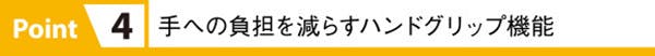指をかけることで手への負担が減るハンドグリップ機能を搭載。