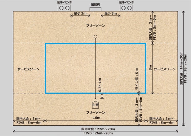 フリーゾーン(コートの外側のプレイエリア)は国内大会の場合最小限3m。FIVB主催大会の場合は5m〜6mとされています。
