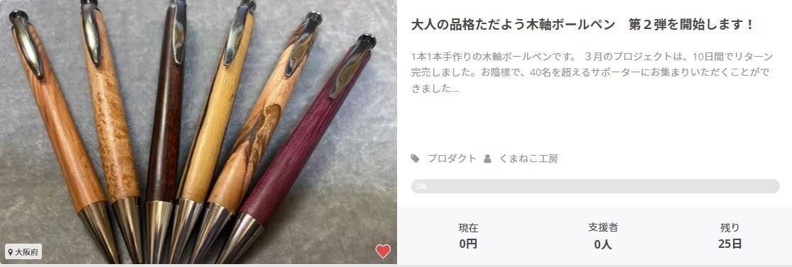 お待たせしました! 今第2弾のプロジェクト開始しました。新しい樹種と、選べる金具、それに新製品「アメリカン・シリーズ」を加えました。ご興味があれば、ご覧ください! → https://camp-fire.jp/projects/view/574934くまねこ工房