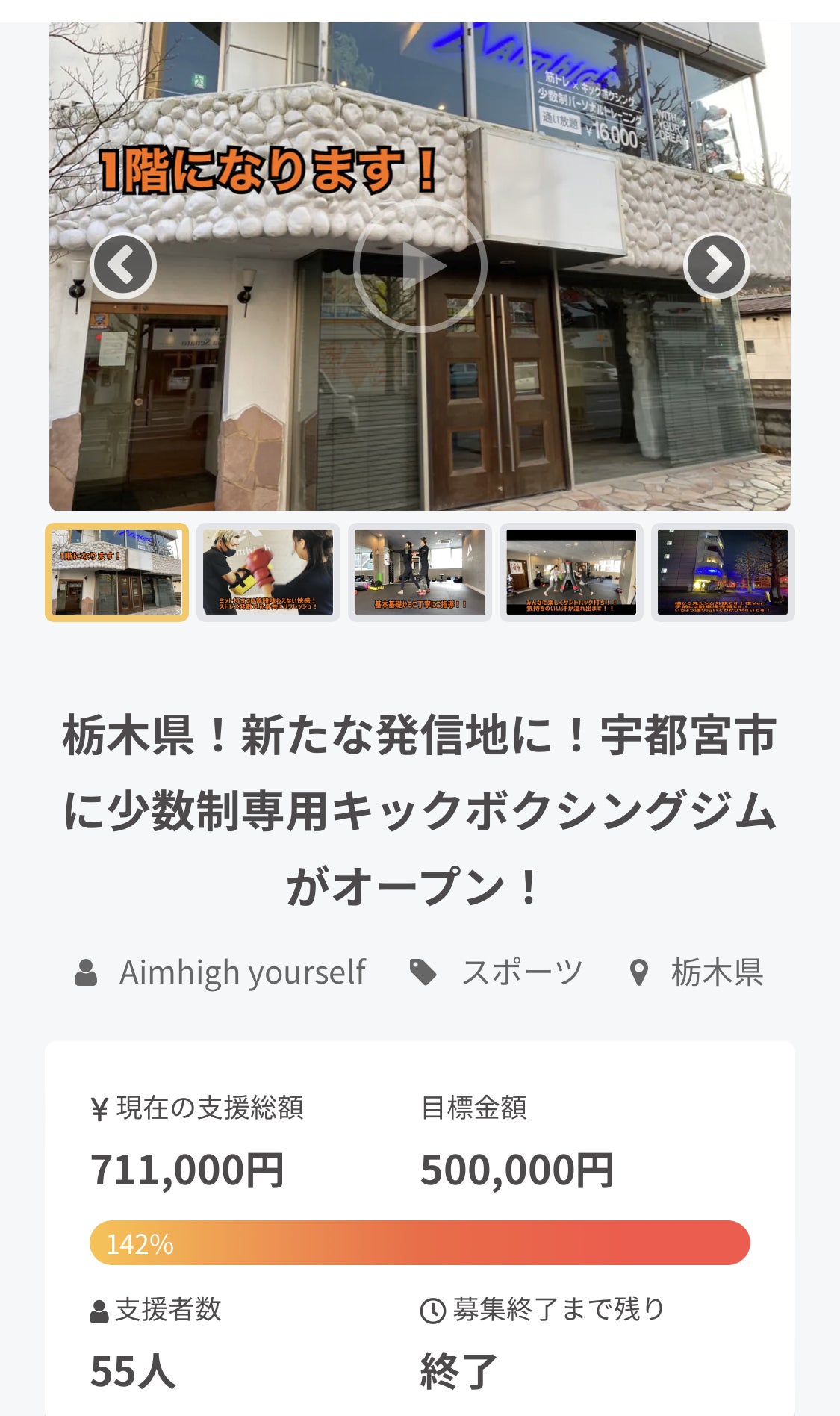 2022/03/27 21:56こんにちは!GRACE FIGHT CLUB 宇都宮【グレイスファイトクラブ宇都宮】代表の覇家斗です。クラウドファンディング募集が終了しました!!たくさんのご支援をいただき、目標金額を達成することができました。ここからです!!!本当にありがとうございます。たくさんの方々に支えられていることに感謝しております。今回の支援金額をジム向上のための設備資金等にあてさせていただきます。たくさんの方々の想いを最高の形に変えて、みんなに愛されるジムにします!!ご支援いただいた皆様には個別でメッセージを送らせていただき、そちらでリターン内容の詳細をお伝えいたします。今後とも【GRACE FIGHT CLUB 宇都宮】を宜しくお願いいたします。ありがとうございました!株式会社Aim high your self代表取締役 斎藤 隼人(覇家斗) もっと見る