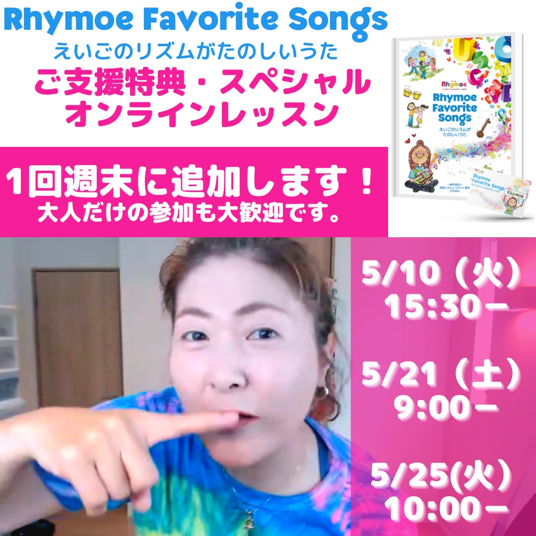 プロジェクトオーナーのYoshimiです。ご用意したスペシャルオンラインレッスン、残り2回となりました。本日は4回目。20組の方にご参加いただきました。ソングブックに収録された音楽をたっぷり使って、 親子で楽しんでいただいた45分。画面越しから、子ども達が親子で笑顔いっぱいに楽しんでくださっている 様子が伝わってきて、とても嬉しかったです!ソングブックは6月下旬に発送の予定です! ※Seasonal Songsとの2冊セットでのご支援の方は、Seasonal Songs完成後、 7月以降の発送となります。ご了承ください。 ===============また、先週から、オンライン特別講座も始まりました!第1回は「アメリカ教育事情」Rhymoeソングブックの編曲及びサウンドプロデュースを担当してくれたMiyukiさんは、現在アメリカで、5歳と1歳のおこさんの子育て中。実際に子育てされている中で経験した、さまざまな 「アメリカ教育あるある」を話していただきました。たとえば、 アメリカのKindergarten(年長相当)は、幼稚園ではなく、 小学校に通います。 つまり「小学校0年生」のような扱いになります。 小学2年生くらいまで、子ども達はずっとフォニックスを勉強し、 たくさん読む練習、書く練習をします。 海外赴任などによって海外から来た子ども達は、レベルチェックを受けた後、 必要に応じてESL(第二外国語)クラスに入ります。 これらを実際の経験とともに、あれこれ話していただきました。 私自身も、かれこれ15年前と10年前の2回にアメリカ赴任を経験しているので、 懐かしい話がたくさん。 参加された方も活発に質問してくださり、 あっという間に1時間が終わってしまいました。 第2回は「フォニックスってなに?」をお届けしました。 英語教育でも「フォニックス」という言葉がますます注目されてきていますね。 子どもに英語を学ばせたいお母さま方も、この「フォニックス」という言葉を見聞きしたことがあるかもしれません。 でもその一方で、SNSを見渡すと、 本当の「フォニックス」とは異なった情報発信をされている方も、少なくありません。そしてその誤った情報に翻弄されている方々も非常に多いように見受けられます。フォニックスってそのそもなんなの? いったい何をしたらいいの? いつから始めたらいいの? そんな素朴な疑問をお持ちの方対象に、 ライモーが考えるフォニックスについて、 Rhymoe Phonicsの共同開発者である、いくみさんに 1時間お話していただきました。 Rhymoeは、リズムと身体の動きに着目した英語メソッドです。 それがなぜ、フォニックスと結びつくの?と思われる方も多いかもしれません。 でも、大ありなんです! あらゆる角度から英語力の土台をつくるRhymoeだから、 フォニックスも小手先だけで終わりません。 子ども達は、勉強している感覚がほとんどなく、楽しいのに しっかり身体に残っている。 そんなライモーフォニックスの話もたくさん盛り込んだ1時間でした。 ご参加いただきました皆様、 本当にありがとうございました!!オンラインレッスンはあと1回(25日)、オンライン特別講座はあと3回です!