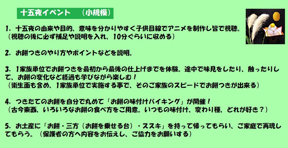 ●日本の行事や文化は自然や人に寄り添いながら生まれてきた。四季を感じ、季節に感謝し、人や子の健康を願い…これが日本の行事や文化の”根底”であり、日本人の誇りである。けれど日本人は他国の人に自国(日本)の良さを伝えられない人が多い。それは「勉強の知識」として学んできたので”他人事”であり知識が薄く自慢する事ではないのだ。日本の行事や文化を体験し”自分事”にする機会が必要だと思う。