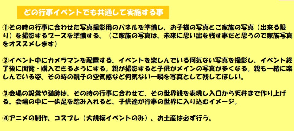 ●子供は成長し、親から離れて行くが行事は毎年続いていく。行事が巡ってくる度に子供は親と過ごした時間を思い出し、絆を再確認する事ができる。行事が親と子の絆を深める。