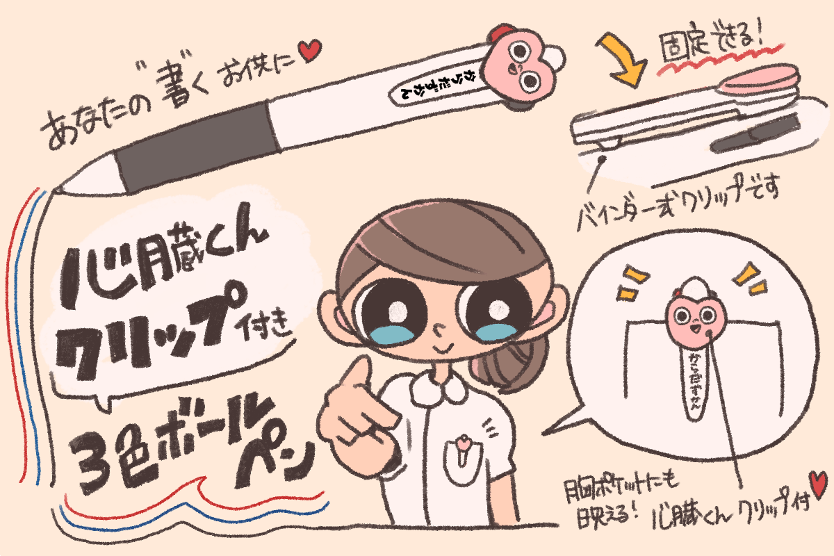 ・心臓くんクリップ付き3色ボールペン