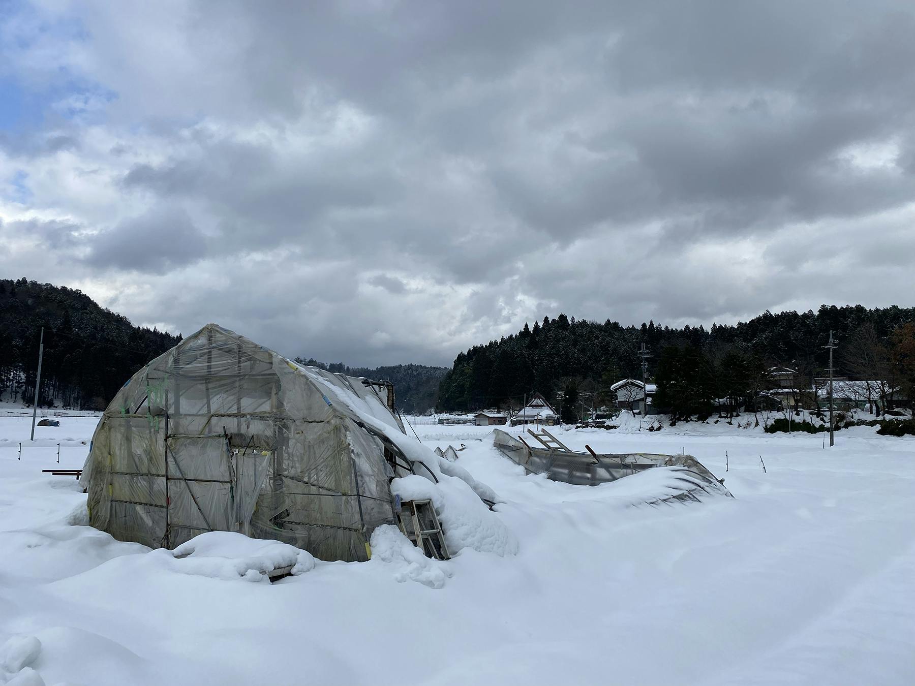 僕はこの農園に出会ってようやく3年目の百姓見習いの身です。この農園のお母ちゃんに教わりながらお米づくりや野菜作りをしています。発見と気づきの日々です。去年から野菜の通販を開始して自然栽培の野菜を求めておられる方々が沢山おられることを知りました。さぁ〜今年からもっと多くの方々に野菜を届けようと意気込んでいたところにこの大雪。育苗用のハウスはペチャンコ、獣の侵入を防ぐ柵もほとんど倒れてしまいました。なんとかこの現状を乗り越えて野菜の栽培・出荷を再開するために皆様のちからをお借りしたいと思います。どうかよろしくお願いします。