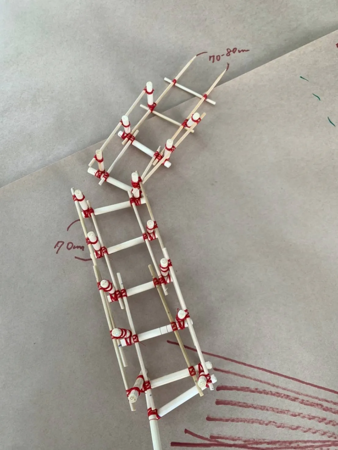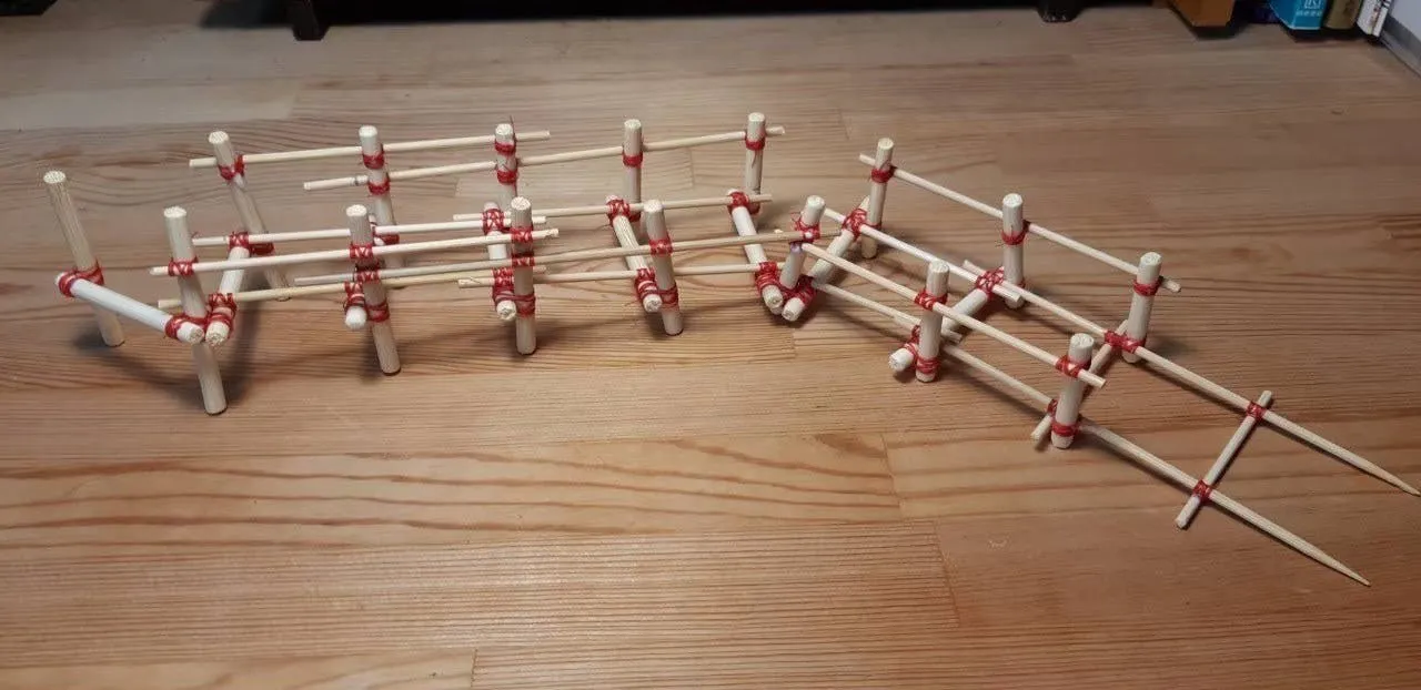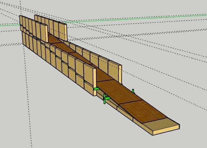 このジェットコースターは高さ1m、全長15m、傾斜5度、で竹や木材を使ってつくります。