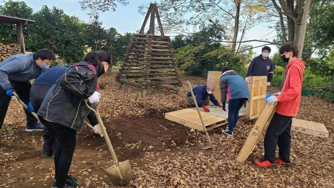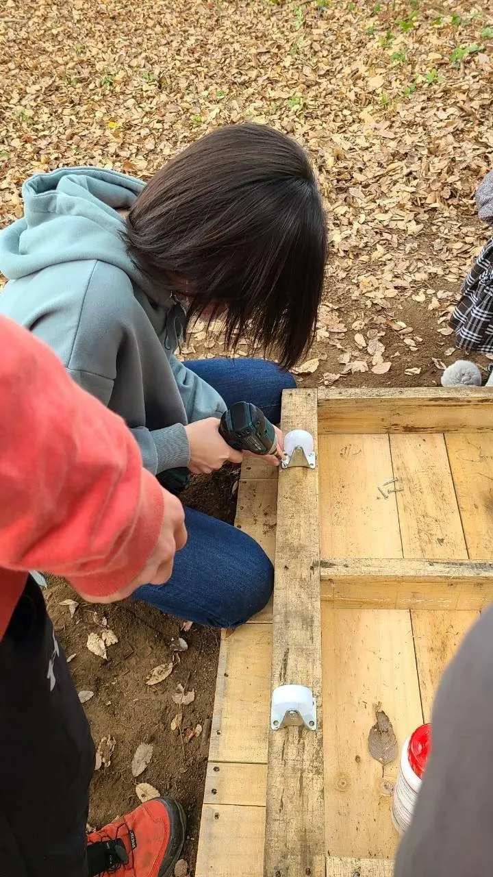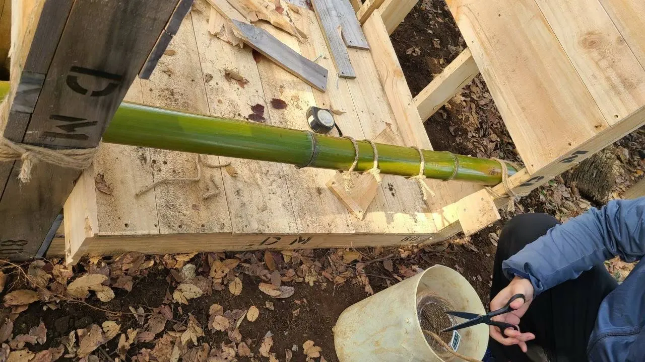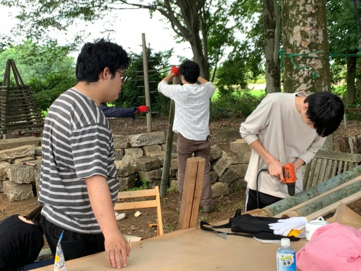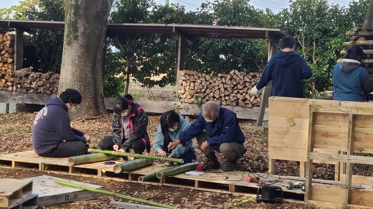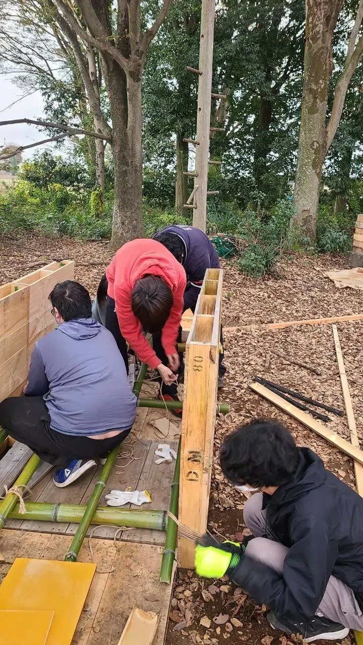 10月 パレット入手で計画変更。材料費を抑えるために、竹やパレットなどを様々な方から譲り受ける。メンバーと一緒に作るため、安全を重視した構造を検討、試作を重ねる。