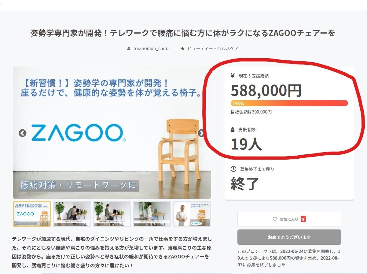 今回、皆様に応援していただくことで、私たちは、このZAGOOチェアーが多くの腰痛肩こりに悩む方々に届くことを願っております。