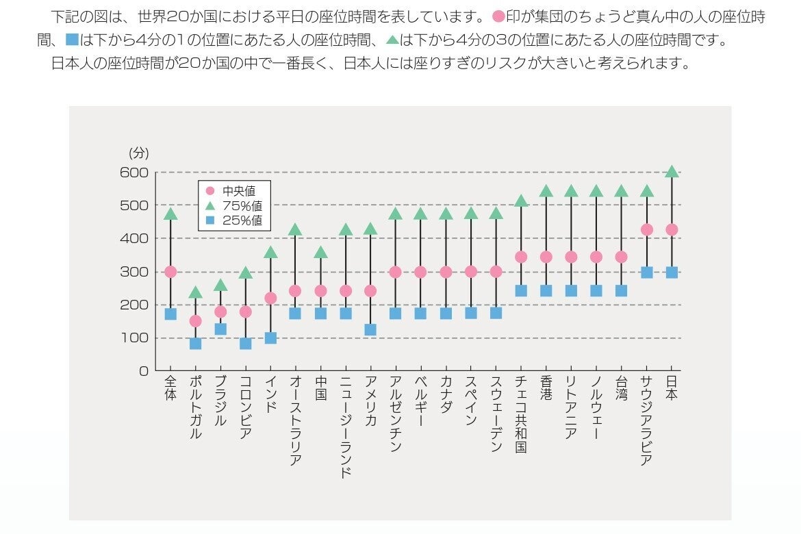 オーストラリアのシドニー大学が発表した研究によると、日本人の平均座り時間は7時間で、世界一座っている時間が長い国民とのことです。