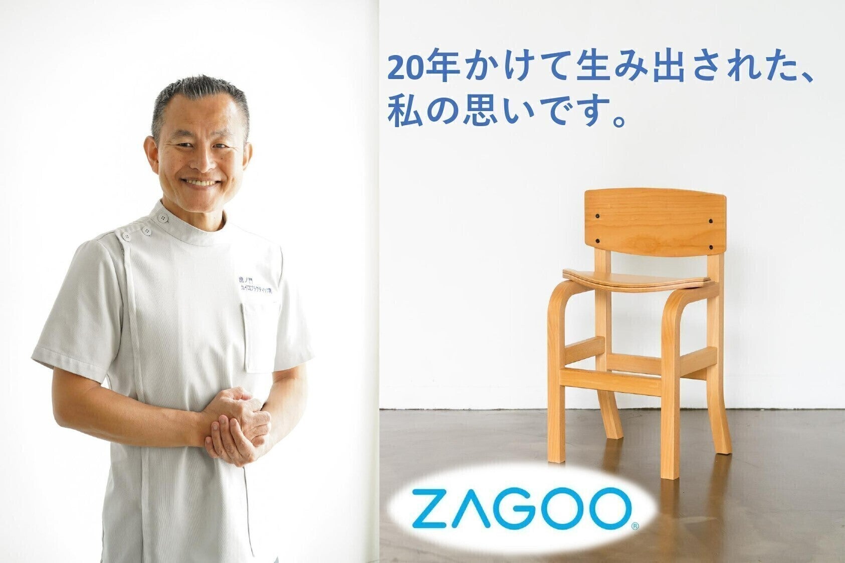 さらに、来院する方々がご自宅でも実践できるように、また、当院にお越しになれない方でも実践できるように、多くの人に良い姿勢を保つ健康な体になってほしいとの思いで、ZAGOOチェアーを開発するにいたりました。