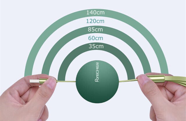 市販の巻き取りケーブルほとんどは120㎝までしか延長できないです。「Ryecher3in1」は長さをアップして、最大140㎝まで調節できます。長さが足らずコンセントに届かない不便を解消します。
