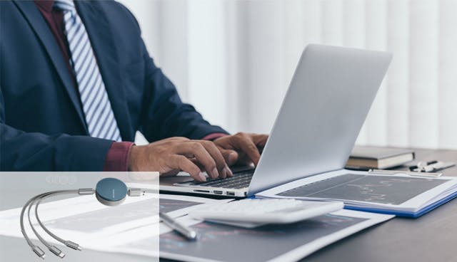 3種類のコネクタ(Lightning、Micro-USB、Type-C)を搭載して、3台接続デバイスへの同時充電を対応できます。接続デバイスを自動的に識別し、最適な電流で急速充電を行います。