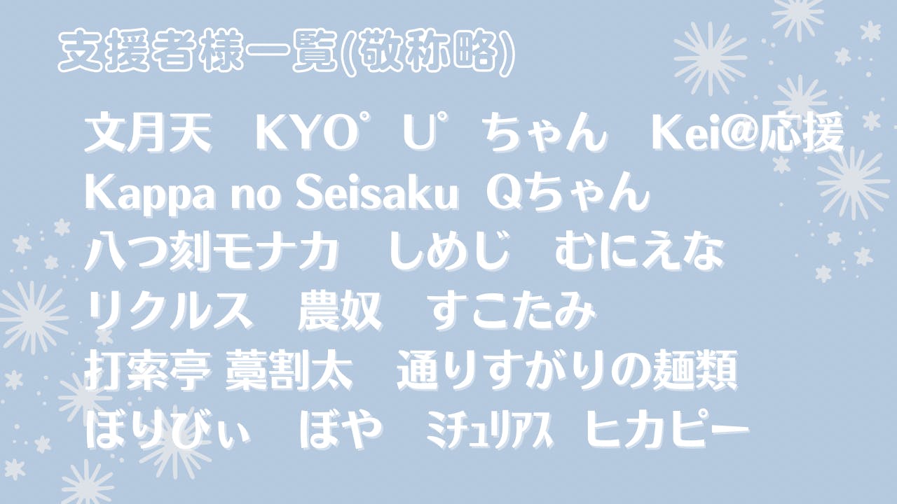 配信上でも紹介させていただいたのですが、こちらにも支援者様一覧の画像を掲載させていただきます。